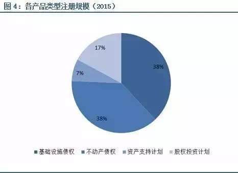 2015年,保险资产管理行业共注册发行保险资管产品121只,注册规模达2706.13亿元 。从产品类型来看,包括基础设施债权、不动产债权、项目资产支持计划、股权投资计划共四种,其中基础设施债权42只,规模1027.45亿元;不动产债权投资计划69只,规模1019.68亿元;此外,项目资产支持计划5只,规模194亿元;股权投资计划5只,规模465亿元(图4)。