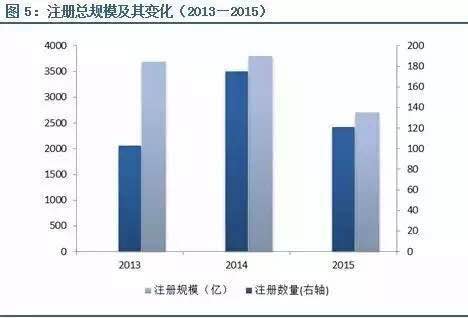 此外,保险资管产品注册制施行以来,注册效率和市场化程度大幅提高,平均注册工作时长缩短到6个工作日。从注册总量上来看,2013年注册各类资产管理产品103项,合计注册规模3688.27亿元;2014年注册各类资产管理产品175项,合计注册规模3801.02亿元;2015年注册各类资产管理产品121项,合计注册规模2706.13亿元(图5)。