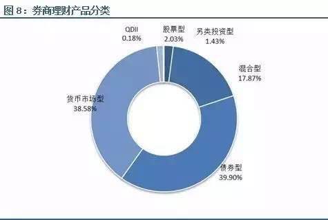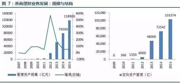截至2015年底,券商资管总规模达11.89万亿,较2014年增长3.94万亿,增幅50%。125家证券公司合计资管净收入274.88亿元,占同年行业主营业务收入的4.78%。 2015年,券商传统集合理财业务同比增长125%。主要以固定收益类资产和现金类资产为主(其中债券型和货币基金型产品份额占比高达78.48%)。2015年券商定向资产管理规模增长42.5%,规模合计10.34万亿,占到总管理资产的86.96%。