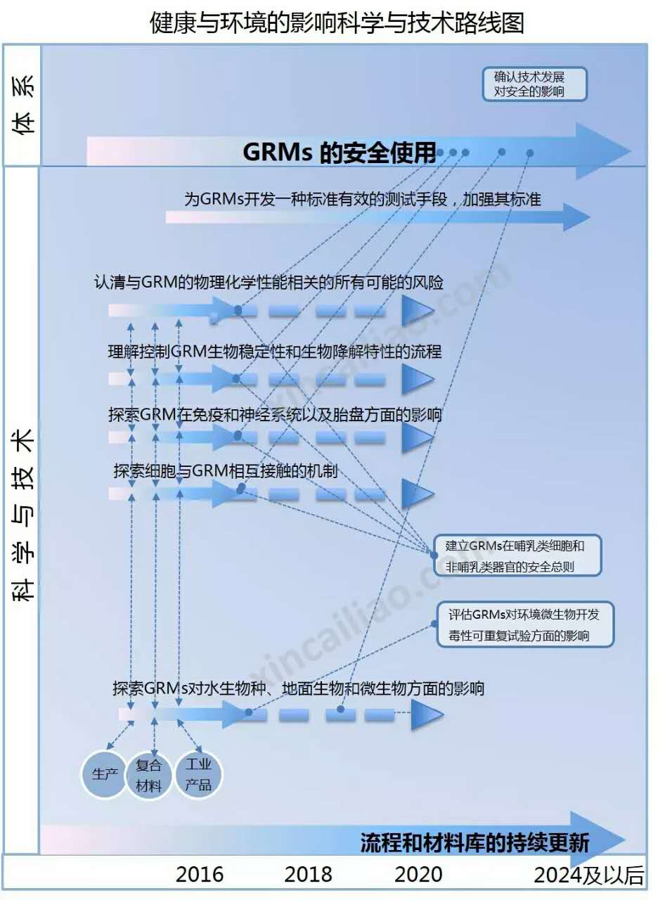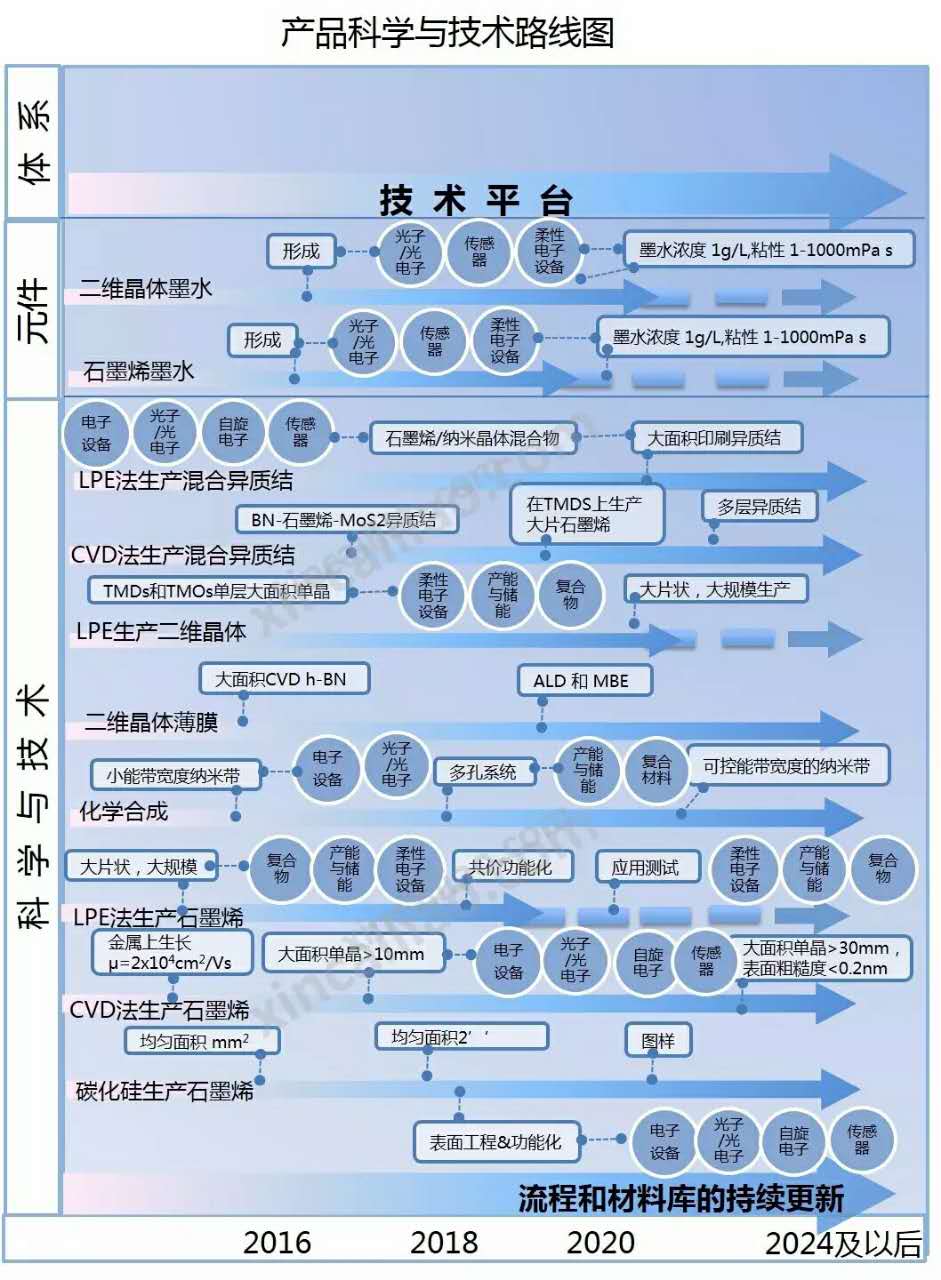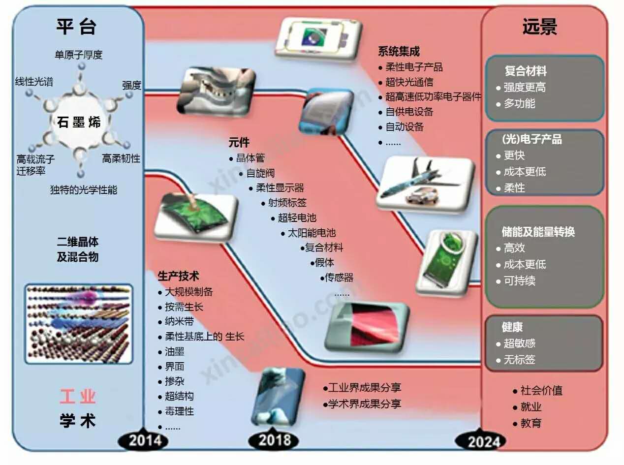 该科学和技术路线图在60多个学者和企业家的共同努力下整合而成。路线图用时间顺序排列每个领域,包括了未来10年及以后,其目的是引导研究界和工业界对基于石墨烯及相关材料产品的开发。