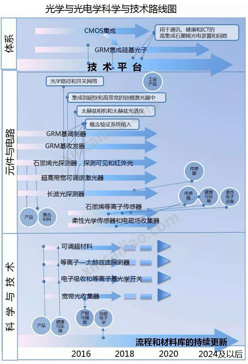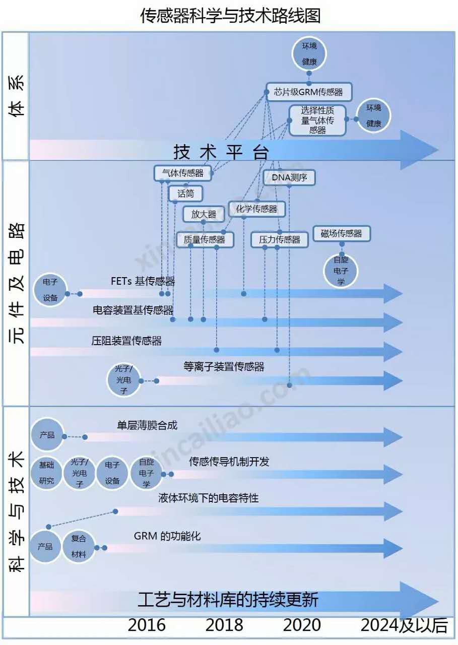 路线图鉴定了11个科技主题,它们分别是:基础科学、健康和环境、生产、电子器件、自旋电子学、光电子和光电子学、传感器、柔性电子,能量转换和存储、复合材料和生物医学设备。以下是每个科技主题的具体路线图。