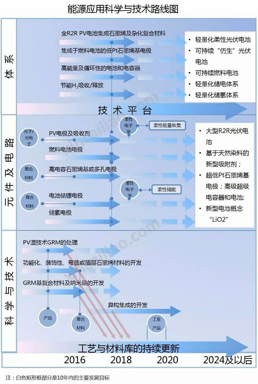 总结:路线图时间表预测,在欧盟石墨烯旗舰的10年期末,产品将贴近柔性电子、复合材料和能源领域的市场。硅集成光子器件、传感器、高速电子及生物医学装置的先进原型预计会出现。