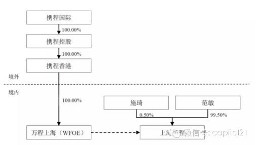 万程上海通过与上海携程签署的协议的相关安排控制上海携程,万程上海是携程香港(Ctrip Travel Holding HongKong Limited)的全资子公司,携程香港是携程控股(Ctrip Travel Holding Ltd)的全资子公司,携程控股是携程国际(Ctrip.Com International Ltd)的全资子公司,携程国际是一家注册于开曼群岛并在美国纳斯达克上市的公众公司(NASDAQ: CTRP)。因此,携程国际通过其间接控制的境内实体万程上海与上海携程及其股东签署的协议的相关安排形成对上海携程的实际控制,且通过上海携程在境内开展实际经营业务。上海携程是携程国际在中国境内的主要经营实体之一。