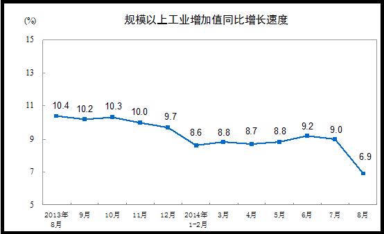 上周末(9月13日),国家统计局发布的经济数据有些令人吃惊。8月份,全国规模以上工业增加值同比实际增长6.9%,增速较7月份回落2.1个百分点,创下六年新低。
