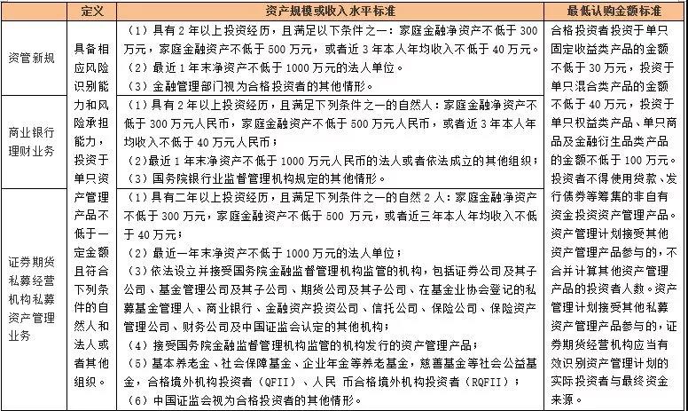 资管新规之后,将合格投资者的认定标准归于统一,从认定原则上延用了2014年8月颁布的《私募投资基金监督管理暂行办法》,即采用资产规模或收入水平和单只资管产品的最低认购金额的双重标准进行认定。(1)资管新规明确金融机构应当按照资产管理产品管理费收入的10%计提风险准备金,或按规定计提操作风险资本或相应风险资本准备,风险准备金余额达到产品余额的1%时可以不再提取。(2)信托公司每年应当从税后利润中提取5%作为信托赔偿准备金,但该赔偿准备金累计总额达到公司注册资本的20%时,可不再提取。同时,信托公司也会计提相应的风险资本。(3)证券公司需要按照资管业务净收入的15%计提操作风险准备,同时还需要计提特定风险资本:第二,投资非标资产的定向资管计划计提 0.90%的风险准备;第五,参与股票质押式回购业务的资管计划加计1.50%的风险准备。(4)基金子公司应当按管理费收入的10%计提风险准备金,达到专户子公司所管理资产规模净值的1%时可不再计提,同时也需要计提风险资本。(5)公募基金应当每月从基金管理费收入的10%计提风险准备金,余额达到上季末管理基金资产净值的1%时可不再提取。资料来源2016年6月证监会发布的《关于修改<证券公司风险控制指标管理办法>的决定》修正。证券公司的风险控制指标体系主要以净资本和流动性为核心。
