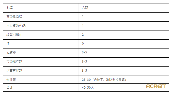 凯德管理的所有购物中心,都有商场办公室负责执行现场的管理。一个10万方左右的购物中心,商场办公室的人员配置一般是: