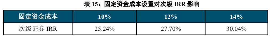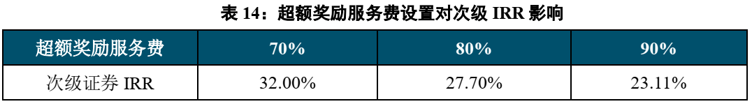 固定资金成本设置的越高,次级证券收益率越高。固定资金成本作为保护次级投资人投资收益的工具,广泛的存在于不良资产支持证券中。 固定资金成本设置的水平直接影响次级证券投资人的收益和贷款服务机构能收取的超额奖励服务费。由下表所示,当固定资金成本由12%上升至14%时,次级证券的内部收益率的增幅大于固定资金成本的增幅,上升了2.34%至30.04%。