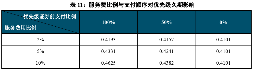 服务费用的后置,可加速优先级证券的兑付,降低证券信用风险。 为了保障优先级证券本息的支付,部分发起机构会将一部分的服务费用放置于优先级本金支付完毕之后再进行支付。在目前市面上发行的项目中,大部分发起机构为了尽快兑付完毕优先级投资人的证券,会将部分服务费用延后支付,例如,将50%的贷款服务机构服务费用在优先级本金支付完毕后再进行支付。当100%的服务费用都在优先级证券前支付时,相当于优先级证券本金的支付速度被略微降低,此时还款速度变慢,久期略延长。同时, 服务费用升高至10%时,由于更多的还款金额被用于支付服务费用,优先级本金支付速度降低,久期相应延长。