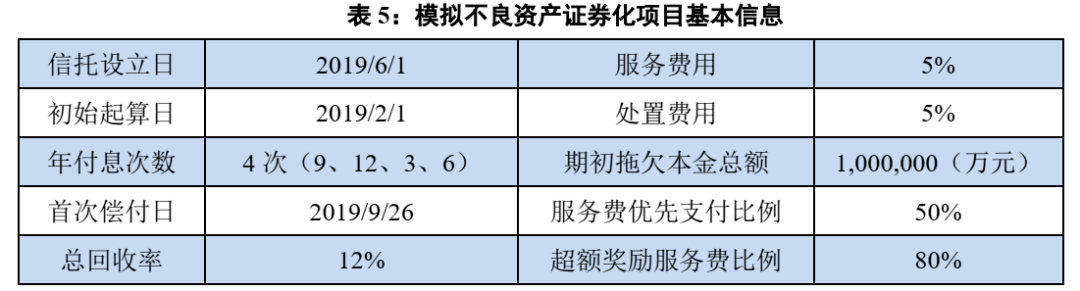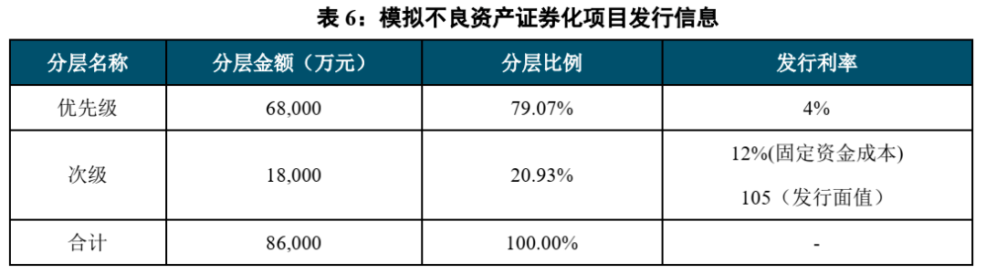本部分我们通过构建一只虚拟不良资产证券化产品,通过定性分析与定量分析相结合的方法讨论不同交易结构设计对优先级本息兑付的信用水平和次级证券的收益率水平的影响。