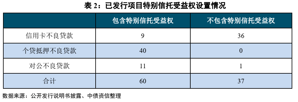 外部流动性支持机构一般选用获得AAA 评级的全国性增信机构,具有较强的担保能力,在流动性储备账户仍无法足额兑付优先级利息时, 流动性支持机构将为优先级资产支持证券利息提供担保,从而获得特别信托受益权。特别信托受益权广泛存在于抵押类不良贷款之中(个贷抵押不良贷款,对公不良贷款)。自2016年以来发行的97单不良资产证券化项目中,共有60单项目包含特别信托受益权。大部分信用卡不良贷款项目由于回款现金流较为可以预期,因此不需要额外使用流动性支持。唯一不包含特别信托受益权的对公不良贷款项目,是建鑫2016年第一期不良资产支持证券,但实际上,建鑫2016-1是分配给流动性支持机构期间收益的,约等于另一种形式的特别信托受益权。