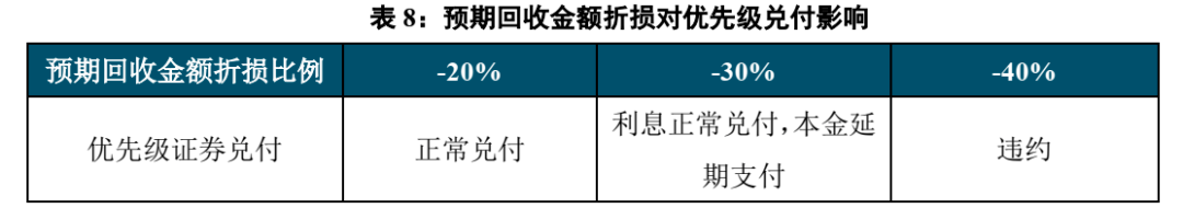 资产池回收金额对证券本息兑付影响很大。 由于本单项目基础资产均为不良贷款,其回收金额主要依赖贷款服务机构的催收工作,有一定的波动性。本单项目优先级占总预期回收金额的56%,回收金额对优先级的覆盖倍数较高。经测试,当预期回收金额折损40%时,优先级才发生违约。