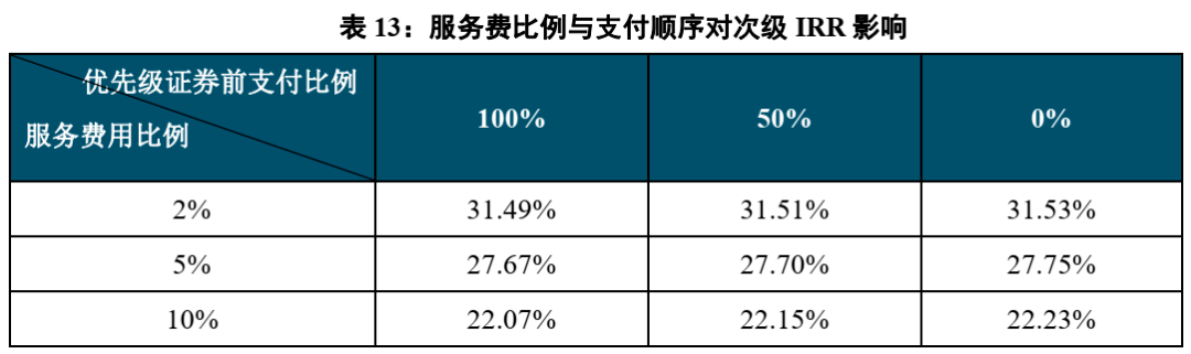 服务费用支付的越多,支付时间越靠前,次级证券收益率越低。为了保障优先级证券本息的支付,部分发起机构会将一部分的服务费用放置于优先级本金支付完毕之后再进行支付。但由于该类费用依然会在次级证券之前进行支付,因此对次级证券IRR的影响不大。当100%的服务费用都在优先级证券前支付时,等于优先级证券本金的支付速度被略微降低,利息支出增加,次级收益略微减少。此外,本单项目设计的5%的服务费用,由于服务费用是直接向回收现金流收取的, 因此服务费用的增加直接等于回收现金流减少,分配给次级证券的现金流相应减少。如下图所示,如果将服务费用提高到10%,则次级证券IRR也会相应减少约5%。