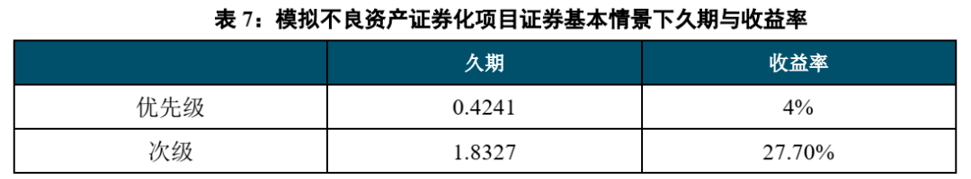 在以上假设情况下,计算得出该只证券优先级的久期约为0.42年,次级的内部收益率IRR约为27.70%。