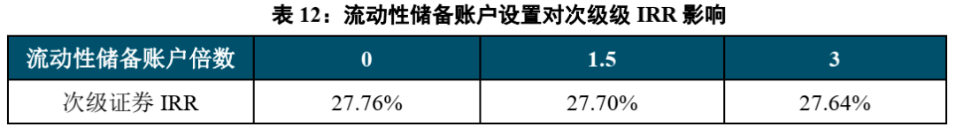 流动性储备账户降低次级证券收益率,但影响较小。流动性储备账户由于将本期的一部分现金流回收款计提至下一个支付日进行使用,因此在一定程度上改变回款现金流的形态。依然设置流动性储备账户金额为当期税费、下期优先级服务费以及优先级利息总和的1.5倍,在优先级证券利息支付之后进行支付。将流动性储备账户的计提倍数提高到3倍时,会有更多的回款金额进入流动性储备账户,从而优先级本金的支付放缓,增加了优先级利息支出,次级的IRR会有少许降低,当流动性储备账户的计提倍数减少到0时,优先级本金支付速度加快,优先级利息支出减少,次级证券IRR升高。
