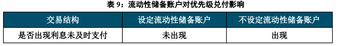 流动性储备账户的设置,可以有效抵御流动性风险,延长优先级久期。流动性储备账户将本期的一部分现金流回收款计提至下一个支付日进行使用,可以在一定程度上改变回款现金流的形态。流动性储备账户可以在一般将应付税费、服务费和优先级利息的总和作为储备金额,以免下一期支付时遭遇现金流流动性紧张,从而避免引发流动性风险。