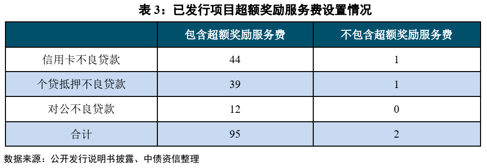 超额奖励服务费的设置可以激励贷款服务机构尽职履责。不良资产支持证券的回款高度依赖贷款服务机构以及其合作催收机构的催收能力, 所以为了促进贷款服务机构的尽职履责意愿,以及避免因预测的基础资产回收金额低于实际回收金额导致次级证券收益率过高,一般会设置超额奖励服务费。超额奖励服务费,或称贷款服务机构的浮动报酬,是按照约定的现金流分配顺序支付完毕次级证券固定资金成本后,剩余回收金额的一部分(30%至80%不等)支付给贷款服务机构的服务费用。在不良项目中,大部分项目也会设立超额奖励服务费。目前仅有招银和萃2019-4和鸿富2018-1未设立超额奖励服务费。