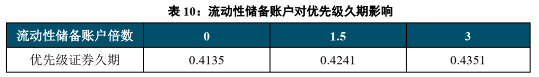 目前市面上一般设置流动性储备账户金额为当期税费、下期优先级服务费以及优先级利息总和的1.5倍,在优先级证券利息支付之后进行支付。流动性储备账户规模的增加会提高对于流动性风险的抵御水平, 但是当储备规模过高时,会延缓优先级证券的支付,如下表所示,将流动性储备账户的计提倍数提高到3倍时,会有更多的回款金额进入流动性储备账户,从而优先级本金的支付放缓。