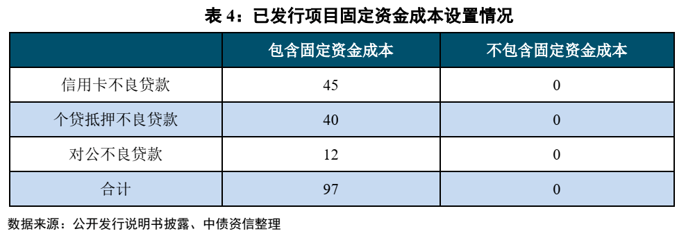 固定资金成本的设置用来一定程度保障次级投资人的收益。不良资产支持证券由于其回款的不稳定性,会在较大程度上影响投资人的投资收益,尤其是次级证券投资人,因此在这种情况下,一般会设立一定的次级证券的固定资金成本(或称预期资金成本),在该部分固定资金成本支付完毕之后,再进行超额奖励服务费的支付。目前在已发行的不良贷款证券化项目中,所有项目均包含固定资金成本的设置。