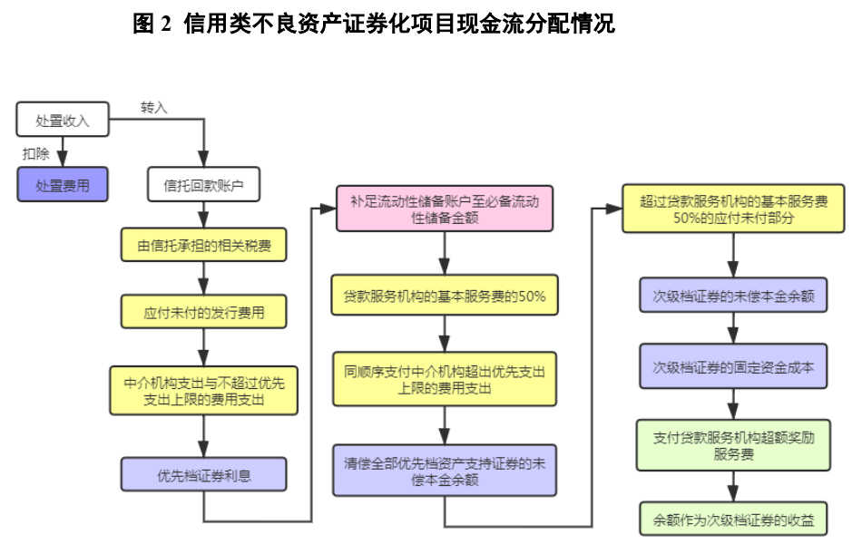 个人信用类不良资产支持证券的还款现金流较为稳定,因此其现金流支付顺序一般较为简单。基础资产回收现金流扣除处置费用后,剩余资金按照重要性由高至低的顺序进行分配: 1)必须支付的重要费用。该类费用如无法按时兑付,则会触发违约事件或流动性支持触发事件。该类费用主要包括:相关税费、发行费用与中介费用、优先级证券利息; 2)优先级本金以及服务费用。该类支出主要为了支付贷款服务机构的基本服务费和优先级证券的本金,主要包括:补充流动性储备金额(如有),超过上限的费用支出,服务费用,优先级本金; 3)次级支持证券持有人的收入。该类支出主要为了保障次级投资人的投资收益,主要包括:次级证券本金以及其固定资金成本 ;4)超额收益。该类支出主要包括:贷款服务机构的超额奖励服务费和次级证券的超额收益。