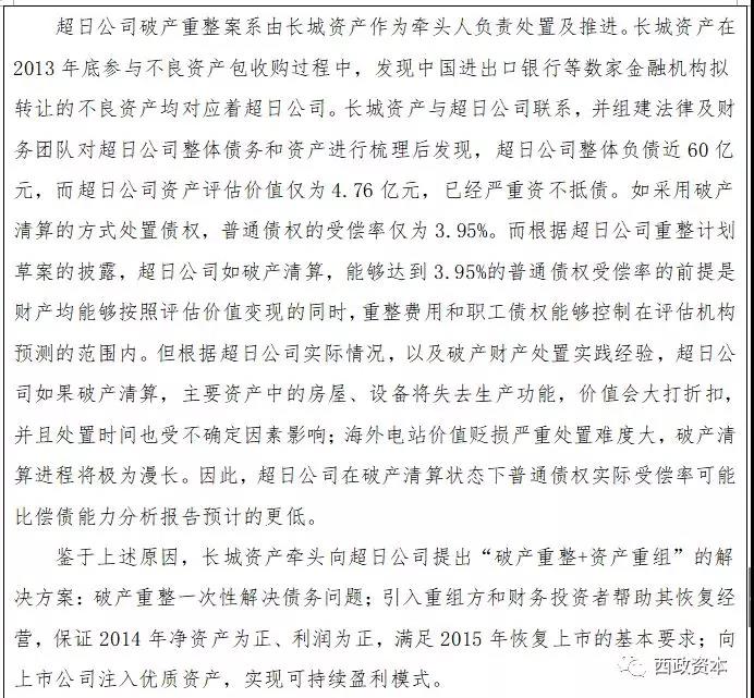 在本案例中,长城资产基于长期处置不良资产业务的优势及对该类业务的敏感度,对出现短期流动性问题的上市公司,及时通过不良资产收购转为其实际债权人。注重研究负债企业的整体财务状况,及时提出重整计划以防止债务企业财务状况进一步恶化,在整体重组中把握主导地位,对重组方案的制定有较大话语权和决定力。