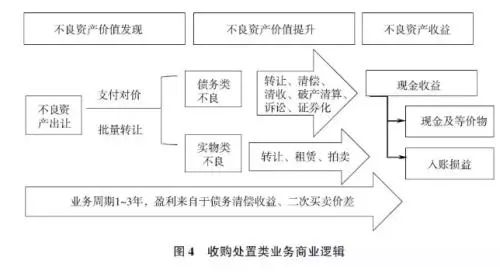 信托公司(或资产管理公司等处置主体)按账面原值的一定折扣收购不良资产,在资产分类的基础上进行价值提升,然后寻机出售或通过其他方式实现债权回收,从而获得收益。