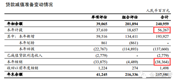 如果是核销,则可以降低不良率和拨备覆盖率,但贷款拨备率反而下降。因为核销会同时将不良贷款可以核销部分和不良贷款账面价值进行冲减,二者等额下降。如下图工商银行2014年核销383.6亿元人民币,意味着其不良贷款余额和贷款减值准备都下降383.64亿。但工行的拨备覆盖率为206%,所以分子分母的同时下降会提高拨备覆盖率。同时贷款拨备率分子是拨备余额,分母是所有贷款余额,工行2014年末是2.34%,分子分母等额下降将导致该比例下降。