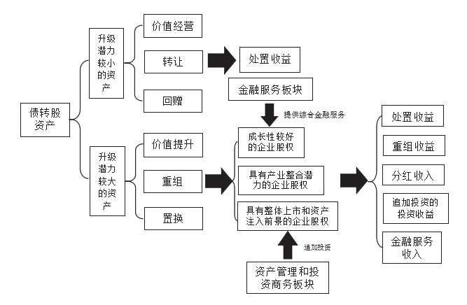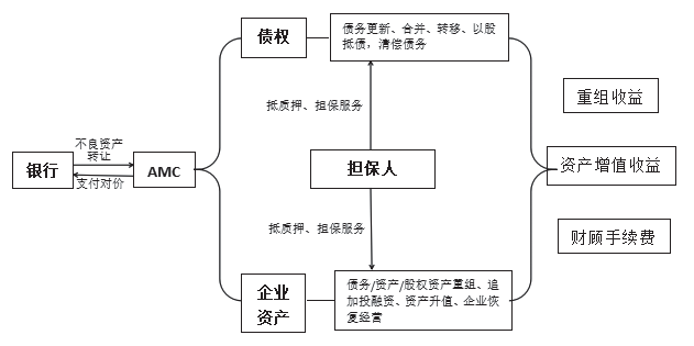 困境企业重整是传统业务中的另一个比较有代表性的模式,对应着图3中的资产溢价部分。其投资策略为:在详细的尽职调查的基础上,选取有阶段性还款困难但尚有核心资产的困境企业,提取出有较大升值空间的生产要素,采用资产重整或债务重整等综合手段,获得增值运作收益。这种业务模式处置周期较长,方案较为个性化,时间和协调成本相对较高。