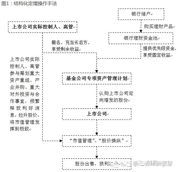 方法方法员工持股计划起源于美国,是员工所有权的一种实现形式,是企业所有者与员工分享企业未来收益权的一种制度安排。员工持股计划在美国资本市场得到了广泛的认可与应用,也取得了很好的市场效果。方法作为西方国家资本市场充分验证过的舶来品,员工持股计划被我国证券监管机构寄予厚望,预期很丰满,过程很多赞,但最终的结果却可能很骨感。方法《关于上市公司实施员工持股计划试点的指导意见》的出台仅仅只是为员工持股计划正名,将我国上市公司员工持股的运作阳光化,却不是我国资本市场员工持股计划的起点。方法暂且不论我国资本市场发展历程中出现的职工持股会和公司职工股,仅就近几年的资本市场来看,员工持股计划真正的起点是“结构化定增”的出现。方法所谓“结构化定增”是指采取“优先”与“劣后”安排:大部分投资者充当“优先级”投资者,提供优先级资金,享受固定收益或有限度的浮动收益;小部分人充当“劣后”角色,承担投资风险,并享受剩余收益。金融机构通过成立专项资产管理计划募集优先级与劣后资金,用于认购上市公司定向增发发行的股份。方法从定向增发的角度,乍一看,证券投资基金参与上市定向增发是再平常不过的情形。但实质上这背后却隐藏着很多不为人知的秘密。方法“结构化定增”案例中,充当“劣后”角色的投资者往往并非外人,而正是上市公司自己的高管和实际控制人,即少数核心员工参与、秘密进行的“员工持股计划”,这也是我国A股市场员工持股计划的早期非正式版本。方法传说中的典型的“结构化定增”是如何操作的呢?(见图1)方法上市公司的高管和大股东为什么兜圈子、费劲周折以“结构化定增”成立专项资产管理计划、担任“劣后”投资者的角色来参与自己公司的定向增发呢?方法这就要从专项资产管理计划本身说起,专项资产管理计划对上市公司高管和大股东有天然的吸引力。方法正常情况下,上市公司实际控制人、高管直接参与认购上市公司定向增发的股份,获得的股份要锁定36个月,而且锁定期满后股份的减持需要提前履行信息披露义务,周期太长、过程繁琐、限制众多,会大大降低获利水平。方法而“结构化定增”却完美克服了上述种种问题:一方面,在“结构化定增”中,证券投资基金的专项资产管理计划无需披露计划持有人,因此上市公司的实际控制人、高管可以私下匿名参与定增,只需遵守12个月的股份锁定期。方法另一方面,由于上市公司实际控制人、高管匿名参与定向增发,12个月的股份锁定期结束后,可以通过证券投资基金自由出售股份获利,而无需履行信息披露义务,大大增加了其股份交易的自由度和获利可能性。方法上市公司的实际控制人和高管对上市公司的重大内幕信息最为了解,最容易利用上市公司的内幕信息获利或通过操纵股价获利,但《证券法》对内幕交易和操纵股价的法律条文堵住了上市公司实际控制人、高管利用上市公司内幕信息、操纵股价获利的途径。方法“结构化定增”的出现为绕过上述法律条文提供了便利,也为上市公司实际控制人、高管提供了“合法”的外衣,上市公司的实际控制人、高管通过私下秘密参与“结构化定增”,以证券投资基金的名义购买上市公司非公开发行的股份,之后通过有目的、有步骤、有计划地释放影响上市公司股价的重大信息,操纵二级市场股价,并择机出售股份获利,全过程做的悄无声息。方法仅仅通过操纵股价、利用内幕信息获利显然还不能满足上市公司实际控制人和高管的胃口,“结构化定增”中优先级资金的存在,为担当“劣后”角色的上市公司实际控制人、高管利用杠杆享受倍增收益提供了机会。方法举例进行说明,以4倍杠杆为例,假设上市公司实际控制人、高管自行筹集“劣后”资金3000万元,专项资产管理计划配套“优先级”资金9,000万元,优先级资金享受7%的固定年收益,该专项资产管理计划总资金12000万元全部用于认购上市公司定向增发的股份,锁定期1年。方法在1年的锁定期内,上市公司实际控制人、高管团队通过筹划重大资产重组、产业并购、重大对外投资等事项进行持续的所谓“市值管理”,不断推高二级市场股价。假设1年锁定期后,专项资产管理计划对外出售股份,获利30%(对于存在“市值管理”或股价操纵的情形下,30%的股份增值是很保守的估计),则总获利金额为12000万元×30%=3600万元,需要扣除优先级资金的固定收益成本9000万元×7%=630万元,由“劣后”投资者享受的收益为3600万元—630万元=2970万元。方法因此,“劣后”投资者(即上市公司实际控制人、高管)利用25%的资金撬动了定增组合里82.5%的收益,这些隐姓埋名的投资者年化收益率为2970/3000=99%,即上市公司实际控制人、高管获得了高达99%的年化收益率。这个收益率是不是很暴利?