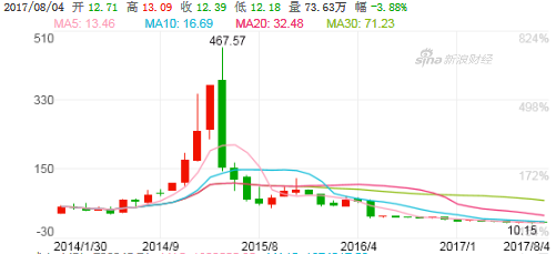 曾几何时,全通教育也是A股市场最为受宠的对象之一,甚至一度头戴“第一高价股”的光环。资料显示,全通教育于2014年初成功IPO,2015年5月13日,该公司股价最高点时曾达到467.57元/股,一度超过彼时的贵州茅台,成为两市“股王”,总市值则高达454.48亿元。然而,仅仅两年多的时间过后,截至8月2日收盘,该公司股价已经跌至了12.50元/股,复权后较历史高点下跌了87.46%,总市值则跌至了79.22亿元,375亿元的纸上富贵就此灰飞烟灭。相比之下,贵州茅台如今则高达482.84元/股(截至8月2日收盘),较2015年的5月13日上涨了120.32%。