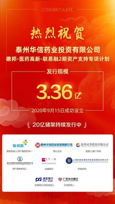 9月15日,医药高新-联易融2期资产支持专项计划成功设立,发行规模3.36亿元。从项目方宣传海报看,本项目核心企业为泰州华信药业投资有限公司,企业实控人为泰州市人民政府。该项目为市场又一单城投供应链ABS项目。
