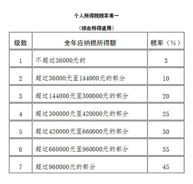 说明: 1.综合所得税率表 注(1):本表所称全年应纳税所得额是指依照《个人所得税法》第六条的规定,居民个人取得综合所得以每一纳税年度收入额减除费用六万元以及专项扣除、专项附加扣除和依法确定的其他扣除后的余额。 注(2):非居民个人取得工资、薪金所得,劳务报酬所得,稿酬所得和特许权使用费所得,依照本表按月换算后计算应纳税额。 2.经营所得税率表 注:本表所称全年应纳税所得额是指依照《个人所得税法》第六条的规定,以每一纳税年度的收入总额减除成本、费用以及损失后的余额。 |