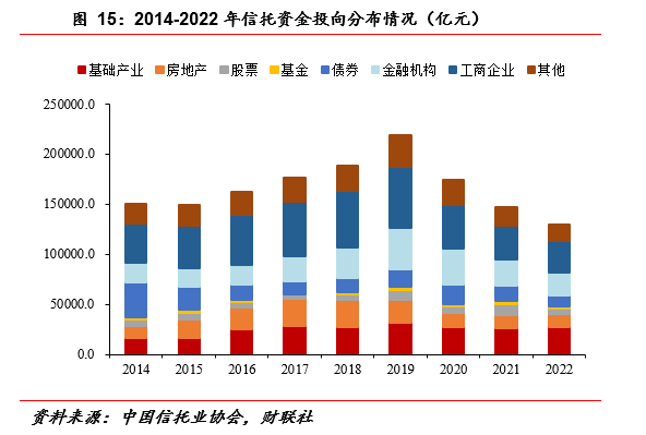 整体规模下滑,投向金融机构的信托资金稳步增长。截至2022年四季度末,投向金融机构的资金信托余额为2.01万亿元,同比增长7.79%,环比增长0.61%;金融机构信托资金的占比为13.39%,同比增加0.95个百分点,环比增加0.07个百分点。