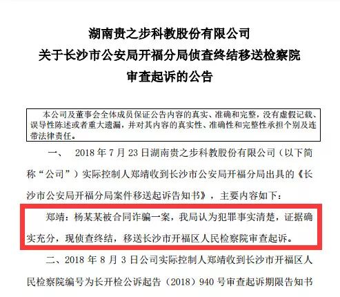 2018年7月3日,贵之步发布公告称,6月27日,法院判决被告郑靖于本判决生效之日起三日内返还原告杨某某788万元,并自2015年5月15日起按中国人民银行同期同类存款利率计付利息至实际清偿之日止。