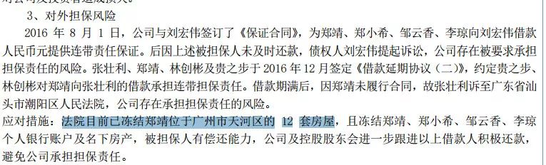 年报显示,由于债务纠纷,法院已冻结郑靖位于广州市天河区的12套房屋。与此同时,2017年3月3日一审法院确认冻结郑靖、公司名下银行存款 863.5万元,