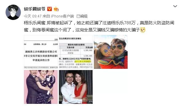 新三板公司贵之步实控人郑靖,涉嫌骗走了湖南电视台知名主持人汪涵的老婆杨乐乐788万,被起诉了。而涉嫌诈骗的郑靖竟然还是杨乐乐的闺蜜。