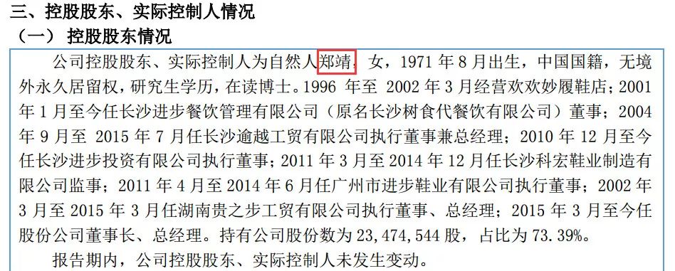 贵之步2017年半年报显示,郑靖,女,1971年8月出生,中国国籍,无境外永久居留权,研究生学历,在读博士。是贵之步的控股股东,并担任公司的董事长和总经理,能够对公司的经营决策、人事任免等产生决定性影响,是公司的实际控制人。