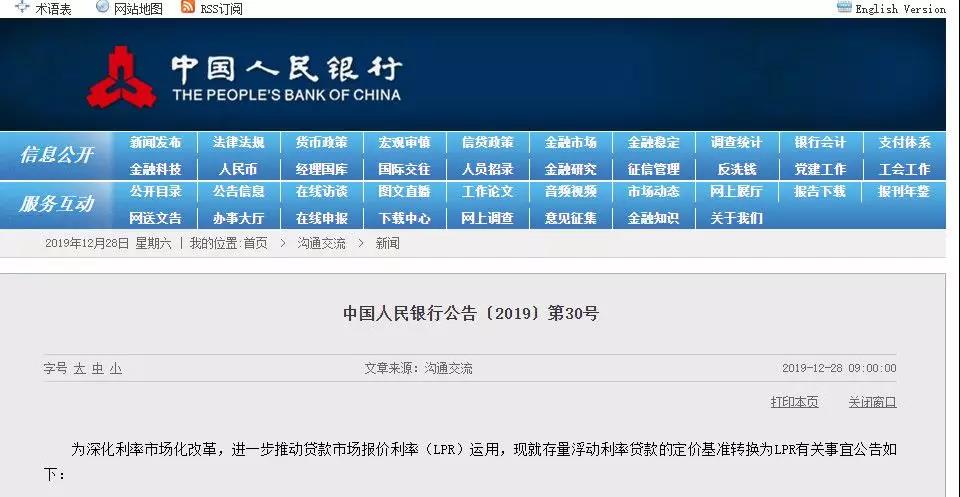 2019年12月28日,中国人民银行发布〔2019〕第30号公告(以下简称《公告》),明确进一步推动贷款市场报价利率(LPR)运用,存量浮动利率贷款的定价基准转换为LPR的有关事宜。