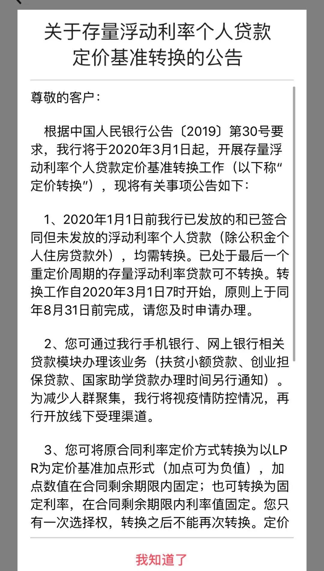 按照央行规定,商业银行应自2020年3月1日起与存量贷款客户正式切换存量浮动利率贷款定价基准,原则上存量贷款利率定价基准切换工作要在2020年8月31日前全部完成。也就是说,存量浮动利率贷款合同在未来半年时间内,都要完成定价基准转换。