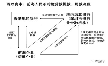 前海跨境人民币贷款系指在前海注册成立并在前海实际经营或投资的企业从香港经营人民币业务的银行借入人民币资金的业务。资金用途上不得用于投资有价证券和金融衍生品,不得用于委托贷款,不得用于购买理财产品,不得用于购买非自用房产等。其基本流程如下: